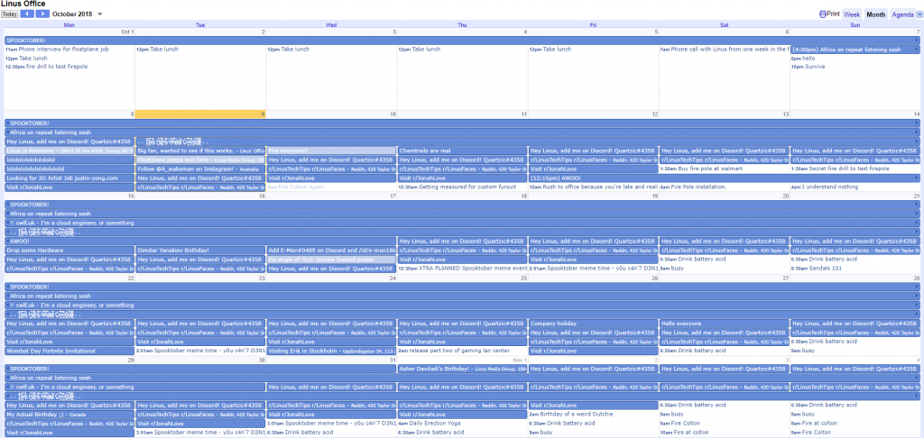 His schedule for today includes such fun activities like listening to Africa on repeat, attending the Sandals and Socks support group, testing the new office firepole, looking at Spooktober memes and, obviously, firing Colton (long-time team member who gets fired on a weekly basis for internal banter). Starting with January 26, 2020, Linus will reserve one hour a day to “regret the decision to allow people to post on his calendar”.